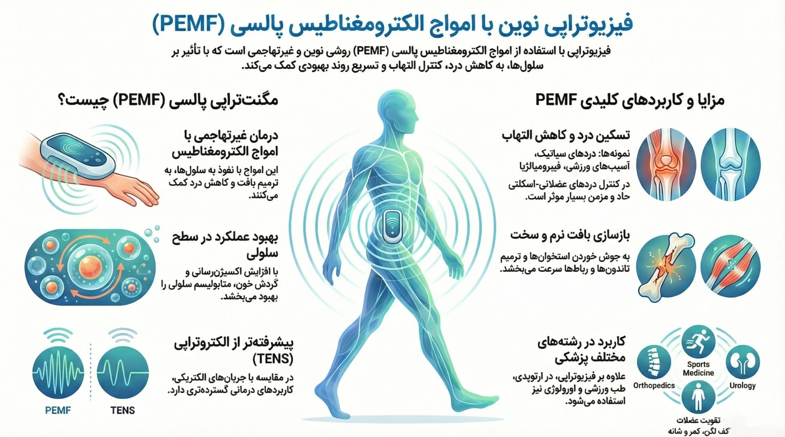 تکنولوژی امواج الکترومغناطیس پالسی یک روش نوین جهت بهبود درد و التهاب ، افزایش قدرت و عملکرد حرکتی در نواحی آسیب دیده در اثر صدمات ، تصادفات ، سوختگیها ، عوارض بیماریهای مادرزادی یا زمینه ای ، ریکاوری اعضا بدن پس از جراحی است که به تنهایی و یا در کنار سایر روشهای فیزیوتراپی توصیه میشود.